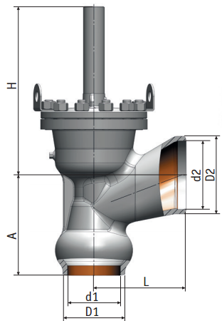 | Обозначение изделия | DN, мм | PN, мПа | Kvy, | F, см2 | L, мм | H, мм | A, мм | d1, мм (d1/D1) | d2, мм (d2/D2) | Pp, мПа | Масса, кг | |