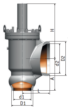 | Обозначение изделия | DN, мм | PN, мПа | Kvy, | F, см2 | L, мм | H, мм | A, мм | d1, мм (d1/D1) | d2, мм (d2/D2) | Pp, мПа | Масса, кг | |
